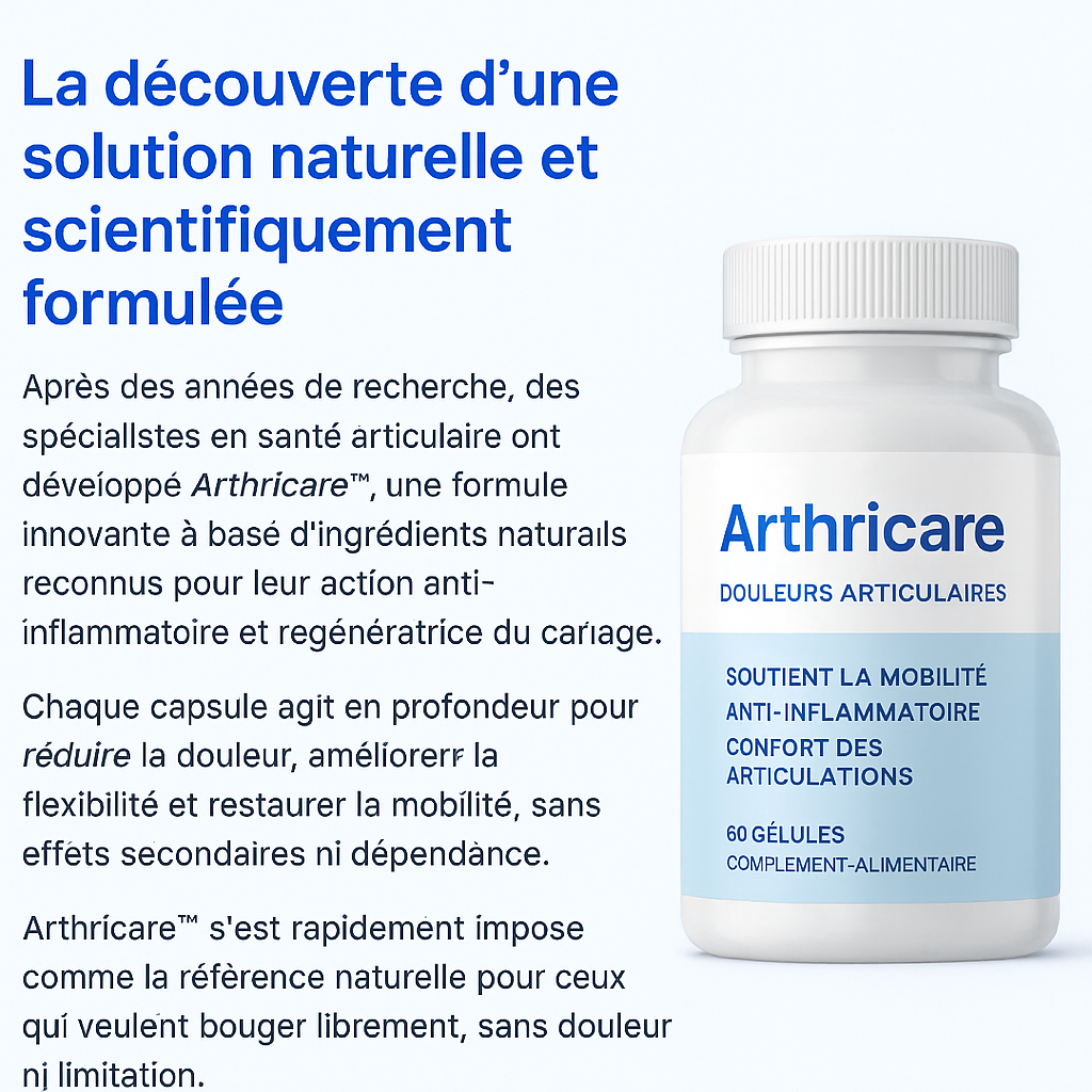 Après des années de recherche, des spécialistes en santé articulaire ont développé Arthricare™, une formule innovante à base d’ingrédients naturels reconnus pour leur action anti-inflammatoire et régénératrice du cartilage.