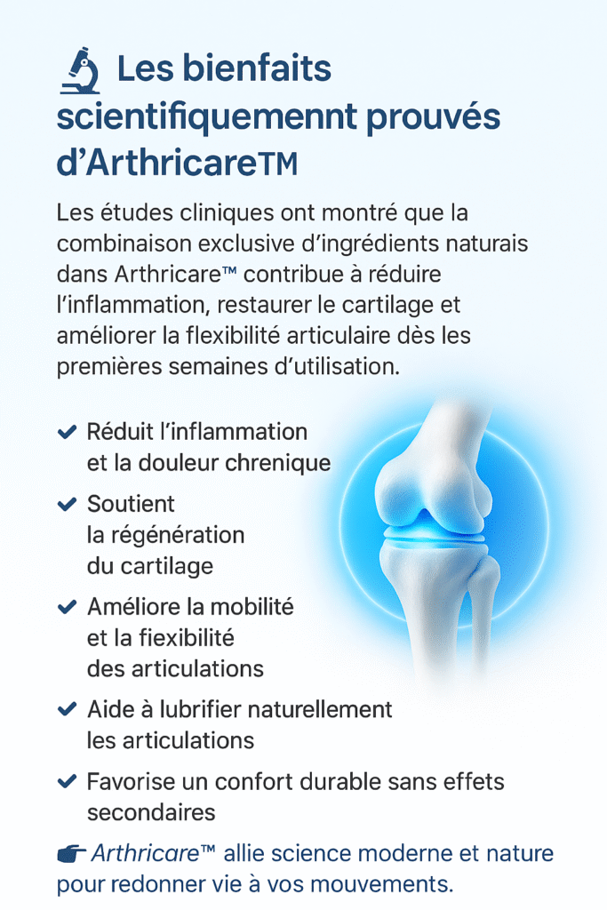 Les études cliniques ont montré que la combinaison exclusive d’ingrédients naturels dans Arthricare™ contribue à réduire l’inflammation, restaurer le cartilage et améliorer la flexibilité articulaire dès les premières semaines d’utilisation.