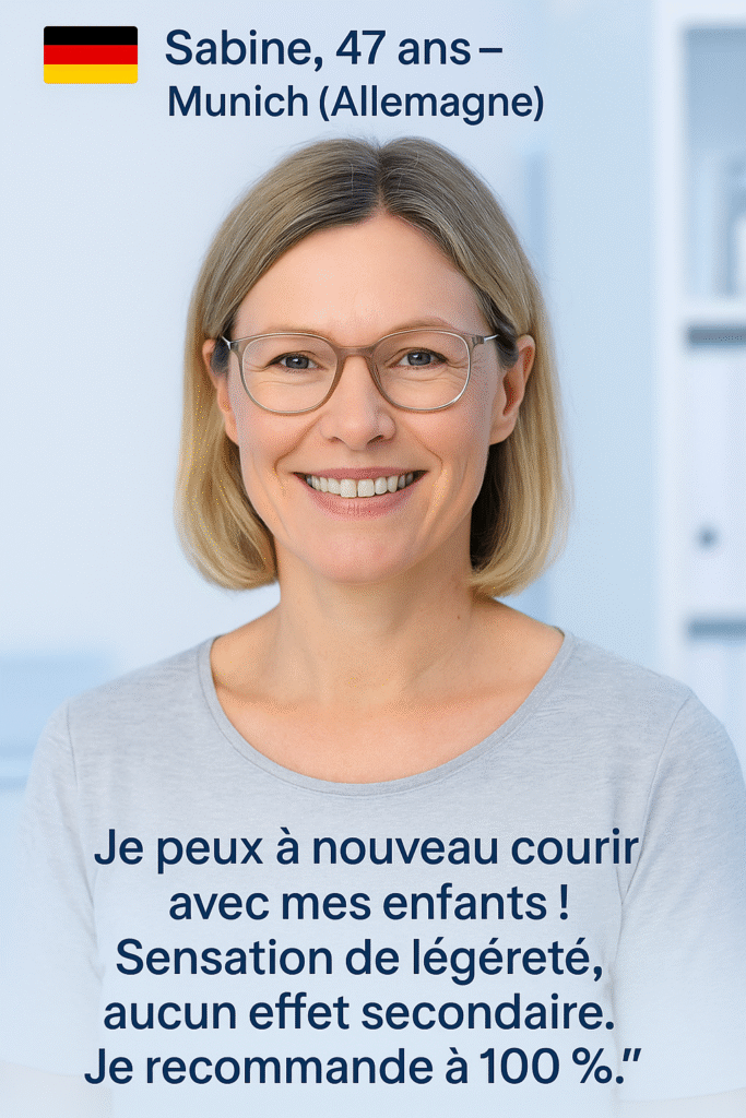 Je peux à nouveau courir avec mes enfants ! Sensation de légèreté, aucun effet secondaire. Je recommande à 100 %