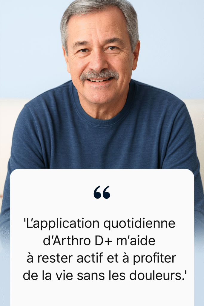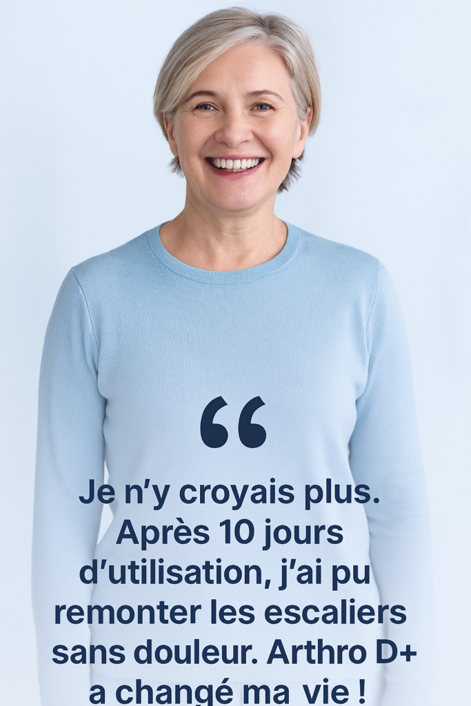 Je n’y croyais plus. Après 10 jours d’utilisation, j’ai pu remonter les escaliers sans douleur. Arthro D+ a changé ma vie !