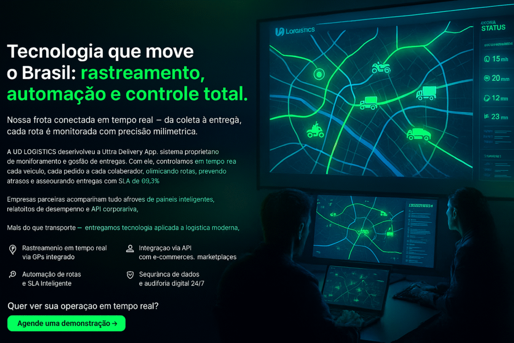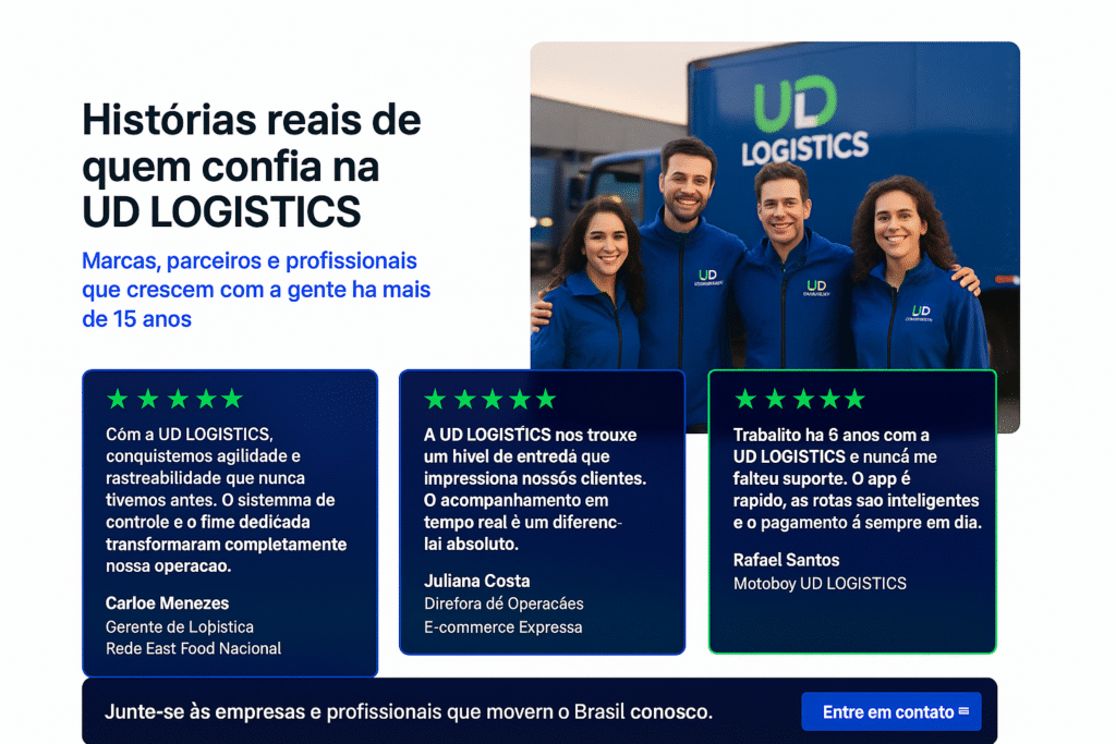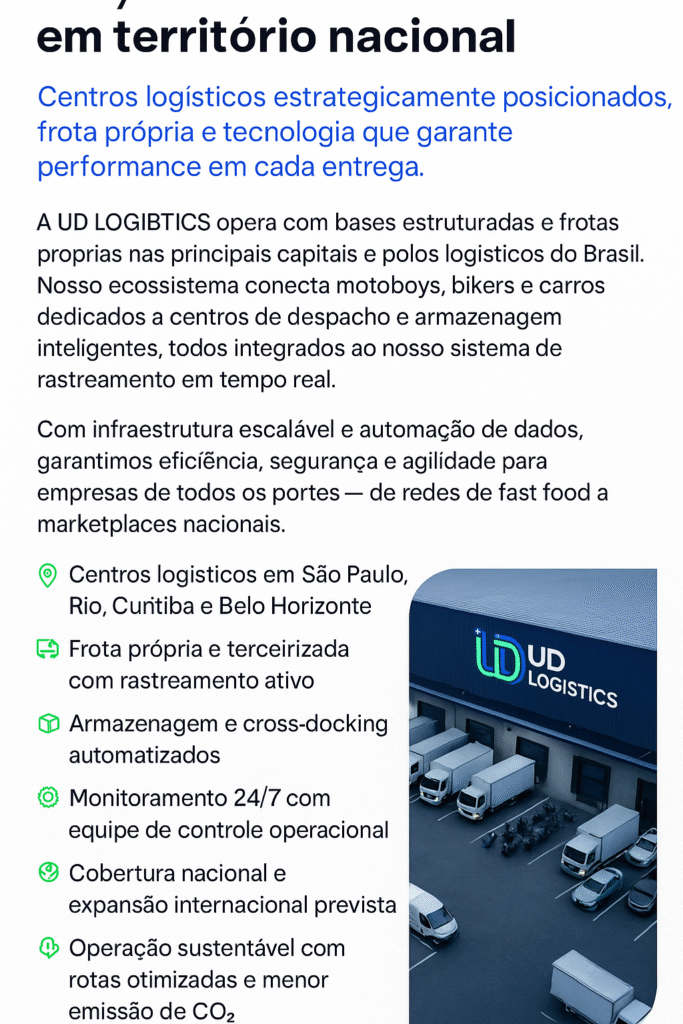 Com mais de 15 anos de atuação no transporte urbano, a UD LOGISTICS oferece soluções completas em logística de última milha, armazenagem e rastreamento em tempo real.